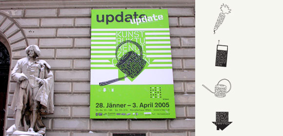 Das Ziel war, möglichst kostengünstig eine hohe visuelle Präsenz zu erreichen. Unsere Idee war, ein einfärbiges Poster mit neongrünen Streifen drucken zu lassen, das mehrfach verwendet werden kann: schwarz überdruckt als Poster zur Ausstellung wie auch als Kopierpapier für Flyer oder Visitenkarten der beteiligten Künstler. Mit Texten auf der Rückseite wurde das Poster auch gleich als Broschüre verwendet.