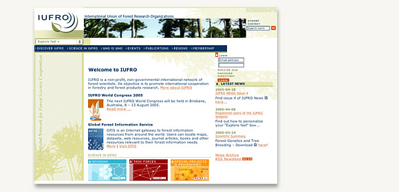 Die International Union for Forest Research Organizations ist eine NGO im Umweltbereich (Wald). Ihre Website dient hauptsächlich dem Informationsaustausch der Netzwerkpartner; und sie ist übersichtlich.